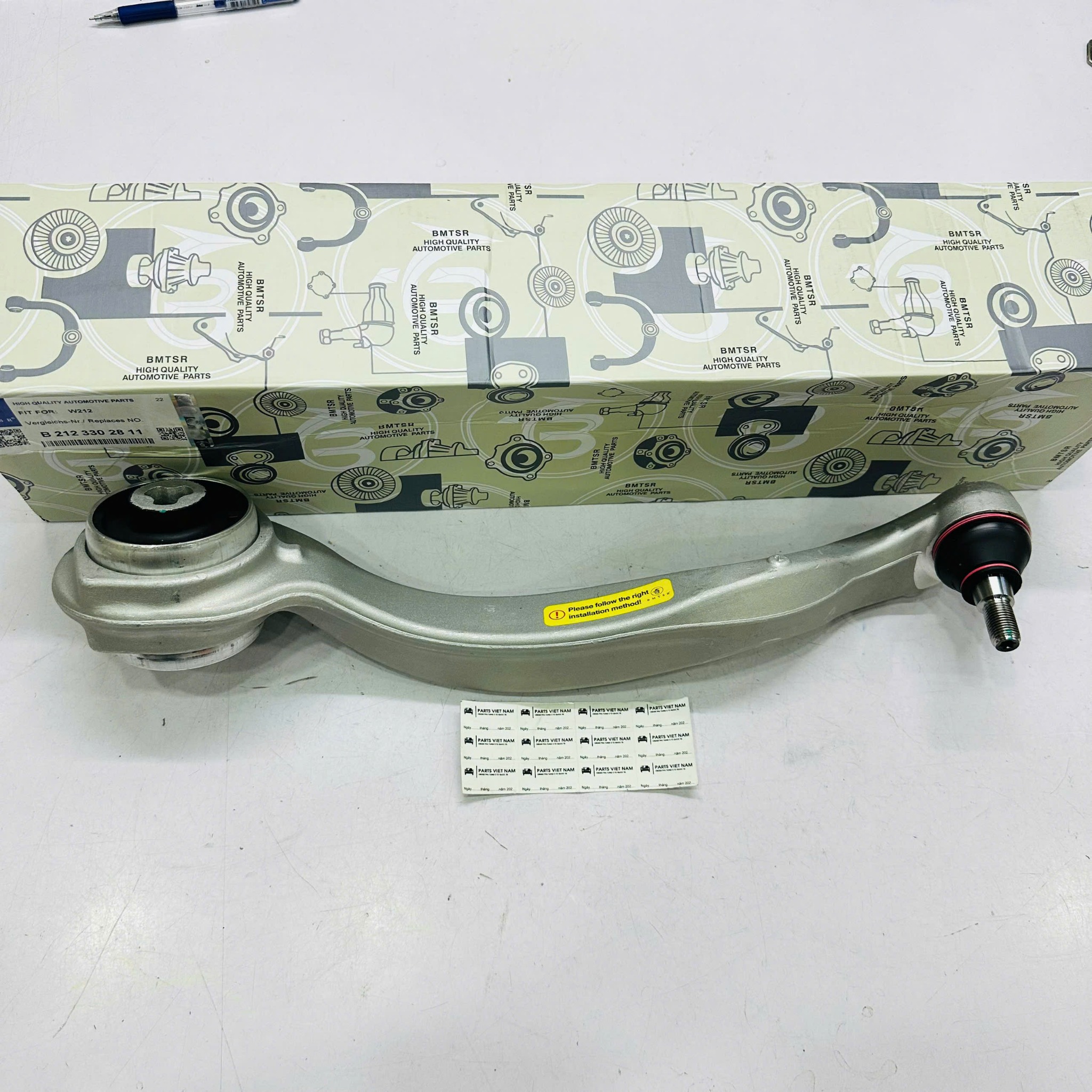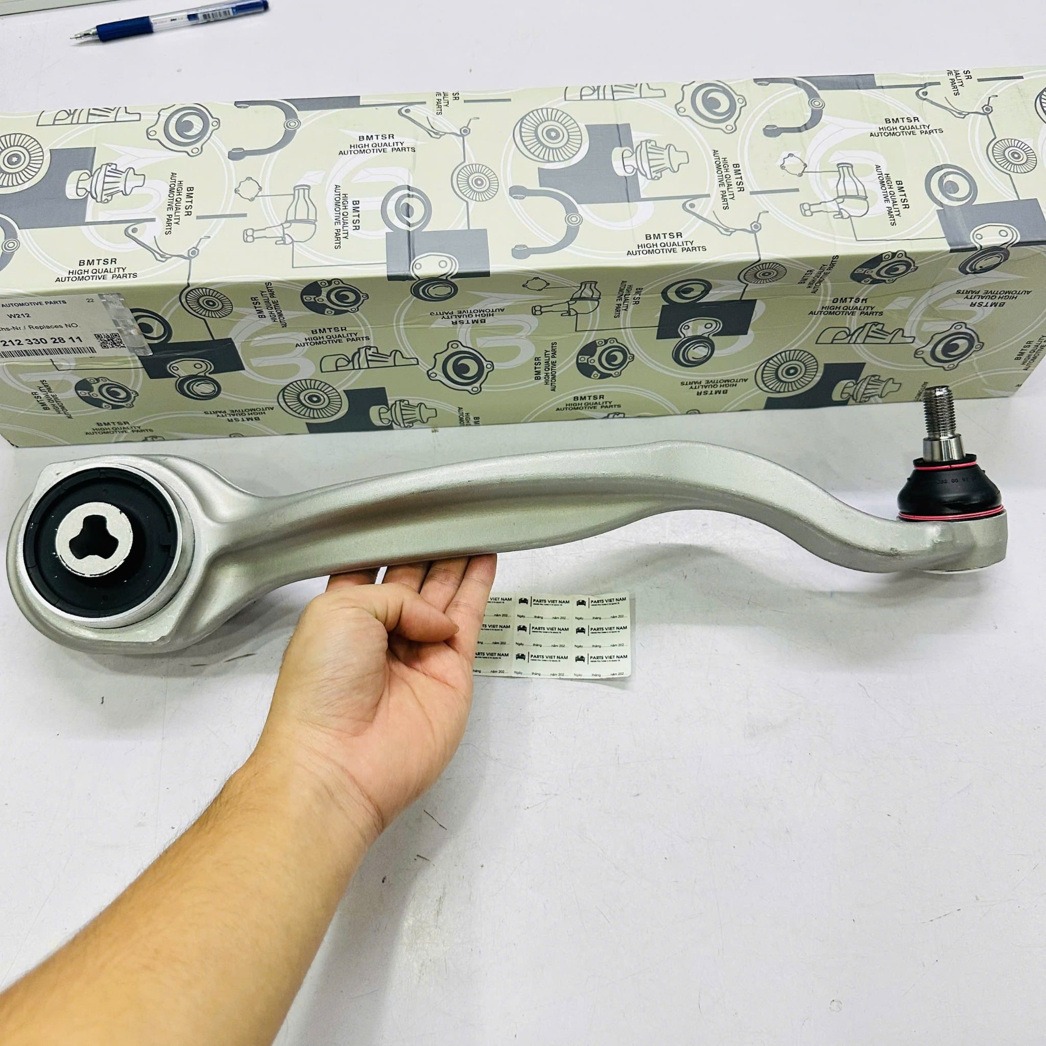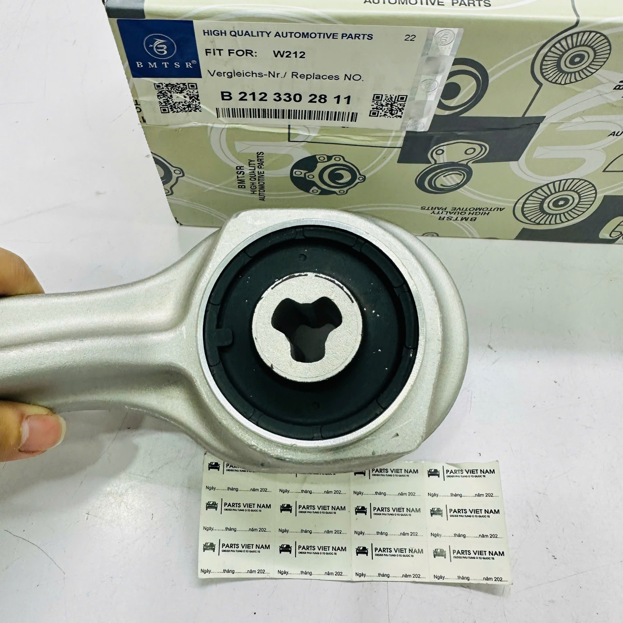 Sản phẩm mã **A2123302811** (hoặc **2123302811**) thương hiệu **BMTSR** là lựa chọn thay thế hoàn hảo. BMTSR nổi tiếng toàn cầu với các phụ tùng gầm cho xe Đức, đảm bảo độ cứng vững của hợp kim nhôm đúc và độ đàn hồi tiêu chuẩn của bạc lót cao su, giúp xe vận hành êm ái như mới.